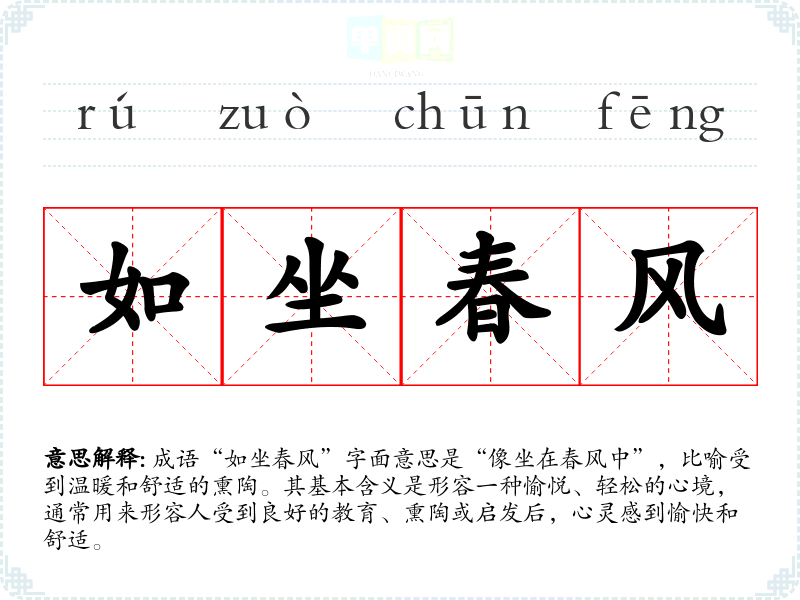 成语“如坐春风”字面意思是“像坐在春风中”,比喻受到温暖和舒适的熏陶。其基本含义是形容一种愉悦、轻松的心境,通常用来形容人受到良好的教育、熏陶或启发后,心灵感到愉快和舒适。