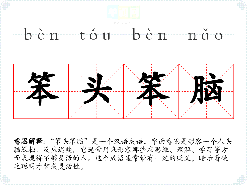 “笨头笨脑”是一个汉语成语,字面意思是形容一个人头脑笨拙、反应迟钝。它通常用来形容那些在思维、理解、学*等方面表现得不够灵活的人。这个成语通常带有一定的贬义,暗示着缺乏聪明才智或灵活性。