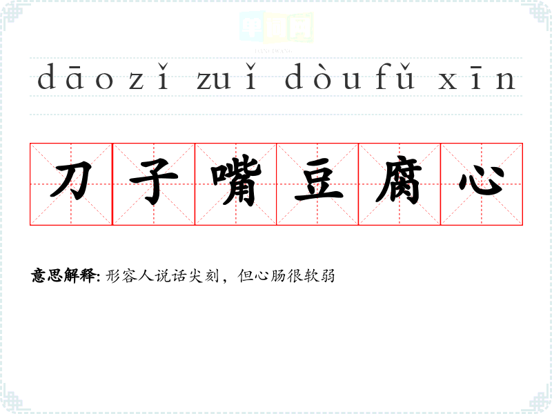 | 刀子嘴豆腐心 | 形容人说话尖刻,但心肠很软弱 |