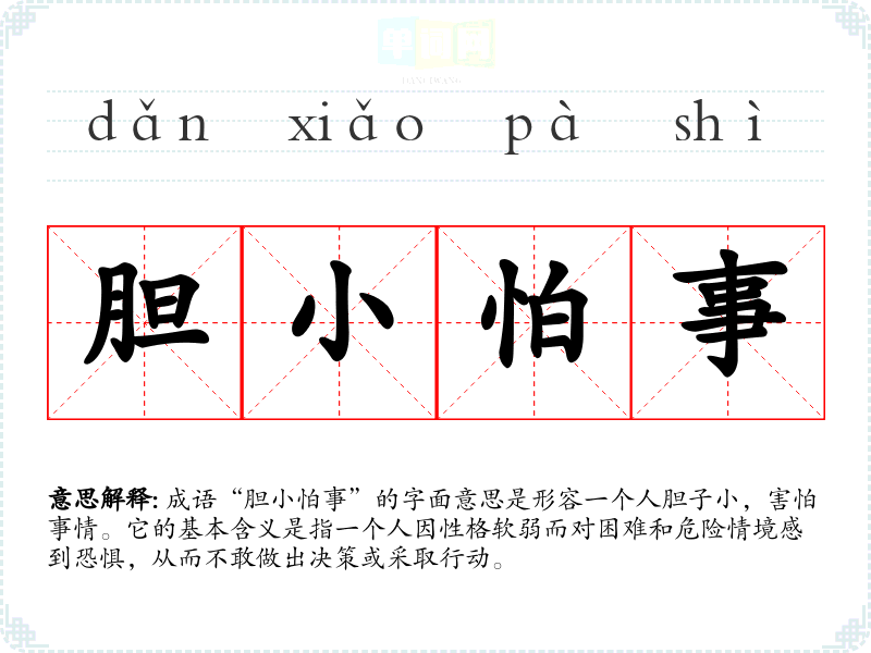 成语“胆小怕事”的字面意思是形容一个人胆子小,害怕事情。它的基本含义是指一个人因性格软弱而对困难和危险情境感到恐惧,从而不敢做出决策或采取行动。