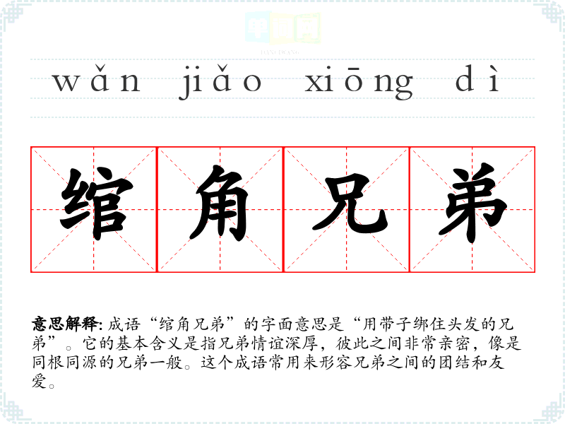 成语“绾角兄弟”的字面意思是“用带子绑住头发的兄弟”。它的基本含义是指兄弟情谊深厚,彼此之间非常亲密,像是同根同源的兄弟一般。这个成语常用来形容兄弟之间的团结和友爱。