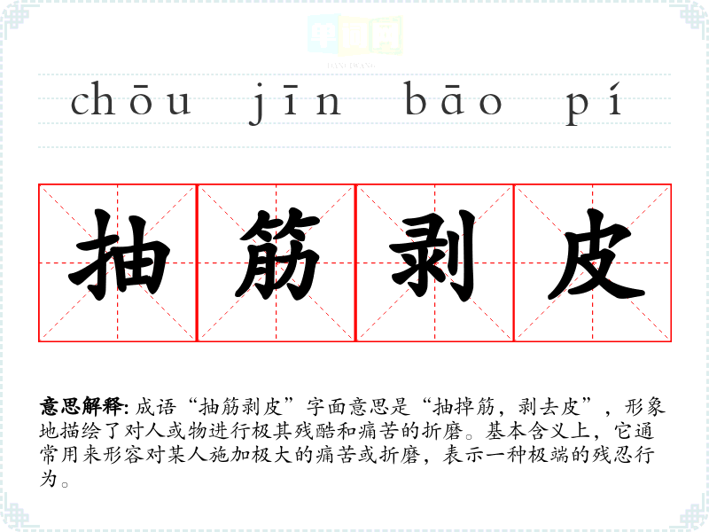 “抽筋剥皮”这个成语的历史背景较为模糊,可能与古代的刑罚有关。在古代,一些残酷的刑罚手段如抽筋、剥皮等被用以惩罚罪犯,成为一种对人身极大伤害的象征。虽然没有明确的典故或文学出处,但其所表现的残酷性质在古典文学中常有涉及。
