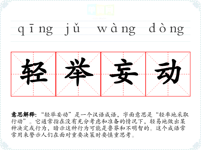 “轻举妄动”是一个汉语成语,字面意思是“轻率地采取行动”。它通常指在没有充分考虑和准备的情况下,轻易地做出某种决定或行为,暗示这种行为可能是鲁莽和不明智的。这个成语常常用来警示人们在面对重要决策时要慎重思考。