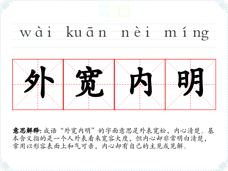 成语“外宽内明”的字面意思是外表宽松,内心清楚。基本含义指的是一个人外表看来宽容大度,但内心却非常明白清楚,常用以形容表面上和气可亲,内心却有自己的主见或见解。