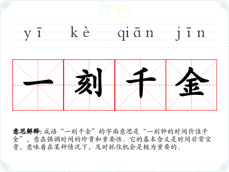 成语“一刻千金”的字面意思是“一刻钟的时间价值千金”,意在强调时间的珍贵和重要性。它的基本含义是时间非常宝贵,意味着在某种情况下,及时抓住机会是极为重要的。