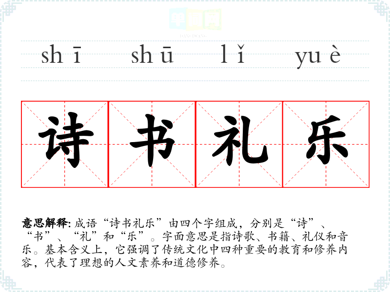 成语“诗书礼乐”由四个字组成,分别是“诗”、“书”、“礼”和“乐”。字面意思是指诗歌、书籍、礼仪和音乐。基本含义上,它强调了传统文化中四种重要的教育和修养内容,代表了理想的人文素养和道德修养。