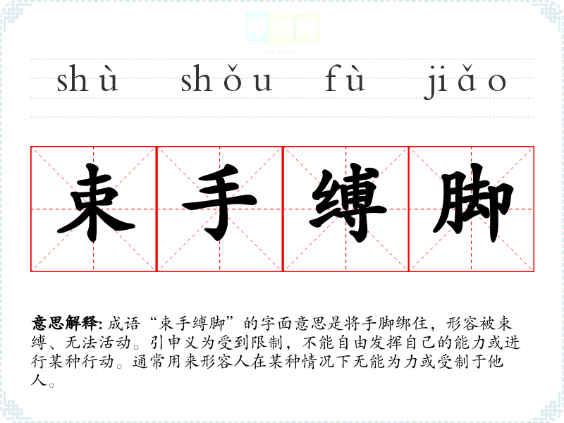 - 日常对话:在朋友间的闲聊中,可以用来形容因为某种原因被限制的状态,比如:“我这次考试准备得不够充分,真是束手缚脚。”