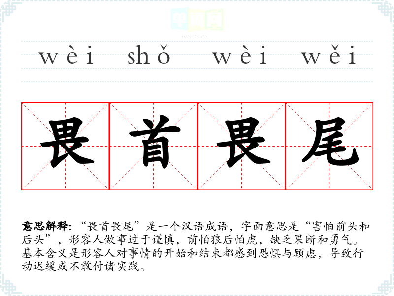 “畏首畏尾”是一个汉语成语,字面意思是“害怕前头和后头”,形容人做事过于谨慎,前怕狼后怕虎,缺乏果断和勇气。基本含义是形容人对事情的开始和结束都感到恐惧与顾虑,导致行动迟缓或不敢付诸实践。