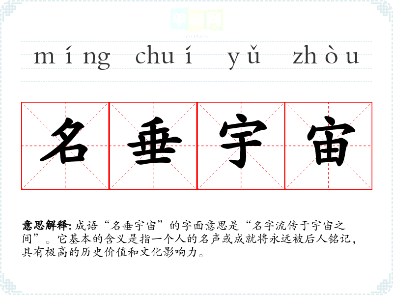 成语“名垂宇宙”的字面意思是“名字流传于宇宙之间”。它基本的含义是指一个人的名声或成就将永远被后人铭记,具有极高的历史价值和文化影响力。