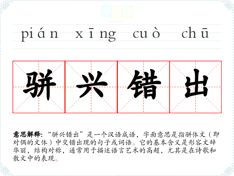 “骈兴错出”是一个汉语成语,字面意思是指骈体文(即对偶的文体)中交错出现的句子或词语。它的基本含义是形容文辞华丽,结构对称,通常用于描述语言艺术的高超,尤其是在诗歌和散文中的表现。