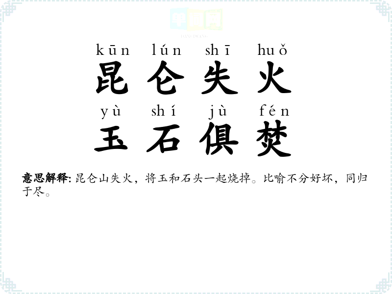 | 昆仑失火,玉石俱焚 | 昆仑山失火,将玉和石头一起烧掉。比喻不分好坏,同归于尽。 |