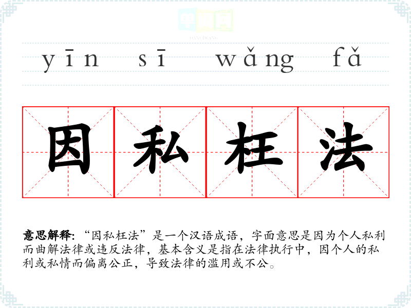 “因私枉法”是一个汉语成语,字面意思是因为****而曲解法律或违反法律,基本含义是指在法律执行中,因个人的私利或私情而偏离公正,导致法律的滥用或不公。