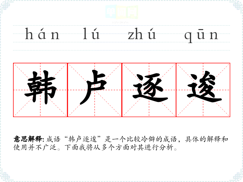 “韩卢逐逡”字面上的意思是指“韩和卢两位诗人互相追逐,逐渐靠近”。其中“韩”指的是韩愈,“卢”指的是卢仝,都是唐代著名的诗人。“逐逡”则有逐渐、缓慢接近的意思。整体上可以理解为对文人之间友好、互相切磋的形象描绘。