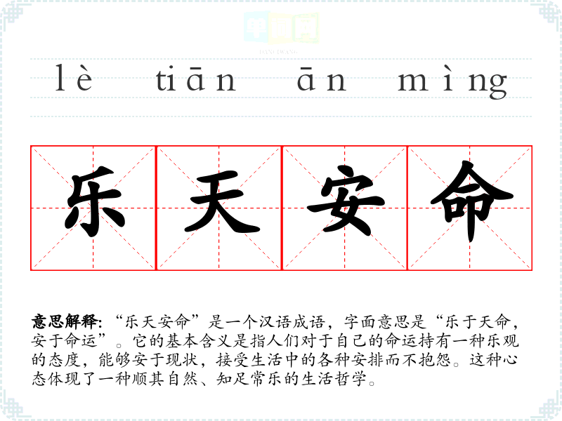 “乐天安命”是一个汉语成语,字面意思是“乐于天命,安于命运”。它的基本含义是指人们对于自己的命运持有一种乐观的态度,能够安于现状,接受生活中的各种安排而不抱怨。这种心态体现了一种顺其自然、知足常乐的生活哲学。