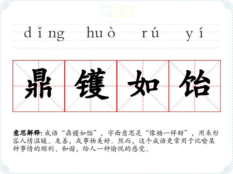成语“鼎镬如饴”,字面意思是“像糖一样甜”,用来形容人情温暖、友善,或事物美好。然而,这个成语更常用于比喻某种事情的顺利、和谐,给人一种愉悦的感觉。