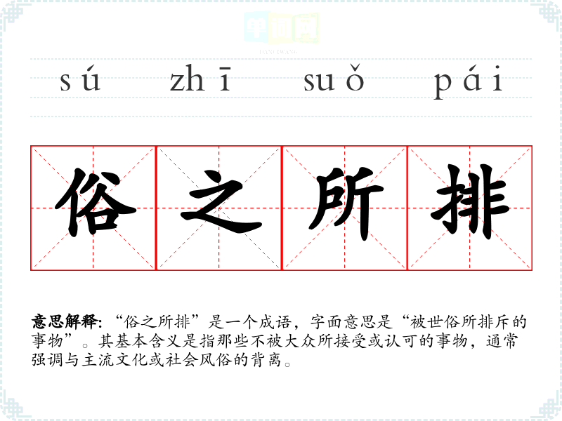 “俗之所排”是一个成语,字面意思是“被世俗所排斥的事物”。其基本含义是指那些不被大众所接受或认可的事物,通常强调与主流文化或社会风俗的背离。