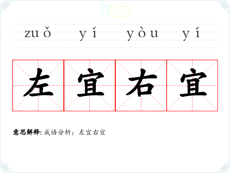 “左宜右宜”是一个成语,字面意思是“左边合适,右边也合适”。引申义指事物的两方面都合适、合理,形容处事周全,考虑周到。
