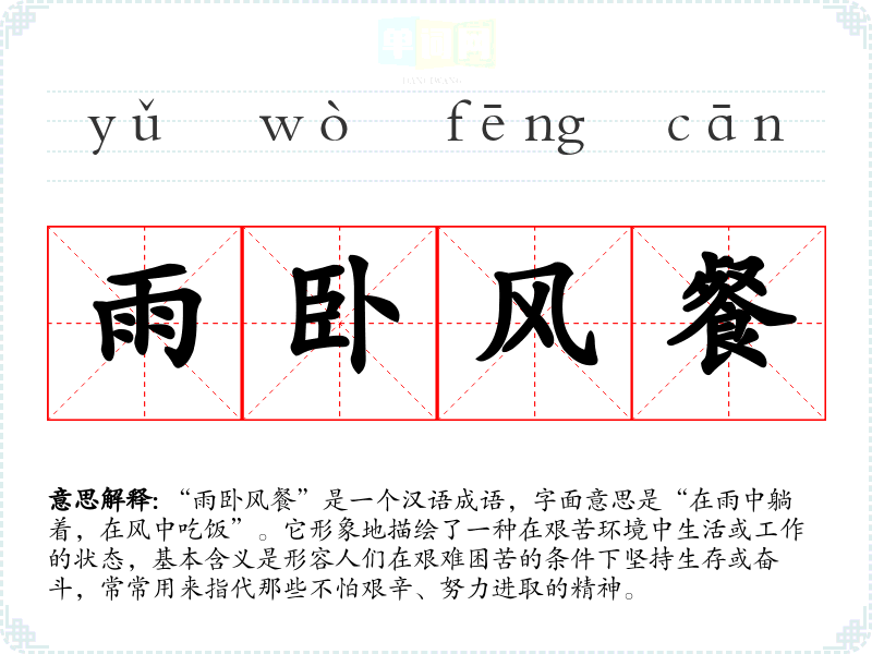“雨卧风餐”是一个汉语成语,字面意思是“在雨中躺着,在风中吃饭”。它形象地描绘了一种在艰苦环境中生活或工作的状态,基本含义是形容人们在艰难困苦的条件下坚持生存或奋斗,常常用来指代那些不怕艰辛、努力进取的精神。