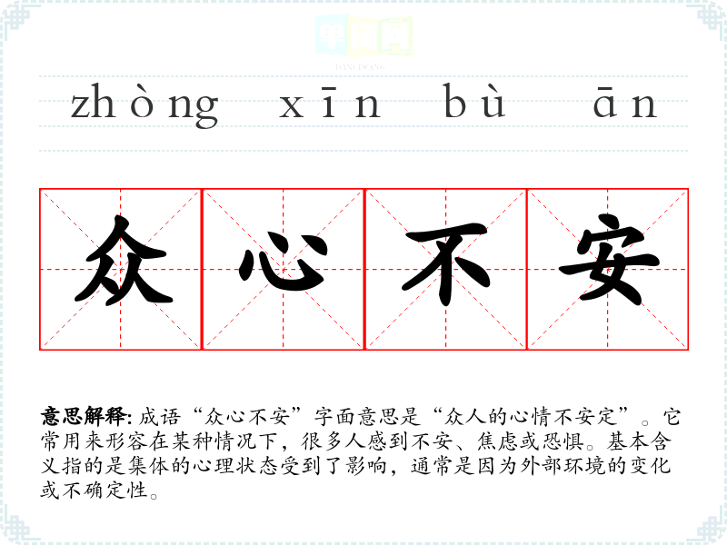 “众心不安”并没有明确的历史典故或文学出处,但其字面构成可以追溯到古代文献中关于众心的记载。古人认为,集体的意志和情感会影响社会的稳定与和谐,因此在政治、军事等场景中,众心的安定与否常常是关键因素。