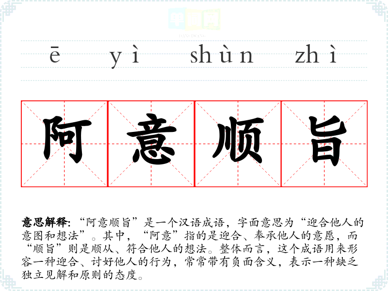 “阿意顺旨”是一个汉语成语,字面意思为“迎合他人的意图和想法”。其中,“阿意”指的是迎合、奉承他人的意愿,而“顺旨”则是顺从、符合他人的想法。整体而言,这个成语用来形容一种迎合、讨好他人的行为,常常带有负面含义,表示一种缺乏独立见解和原则的态度。