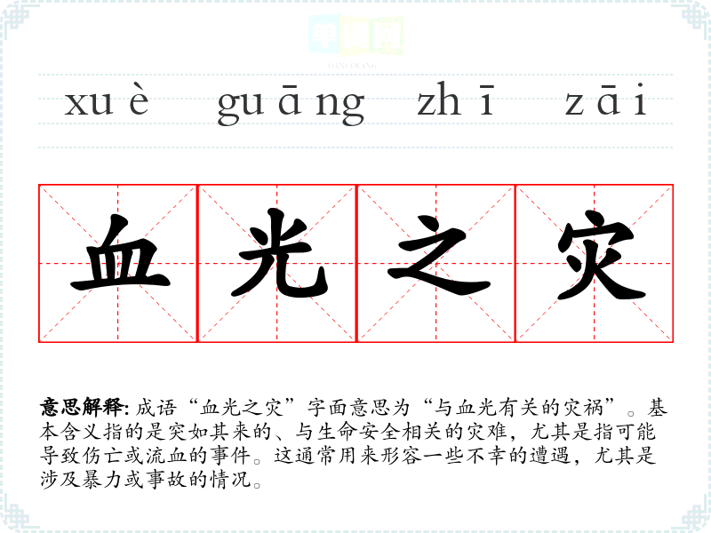 成语“血光之灾”字面意思为“与血光有关的灾祸”。基本含义指的是突如其来的、与生命安全相关的灾难,尤其是指可能导致伤亡或流血的**。这通常用来形容一些不幸的遭遇,尤其是涉及暴力或事故的情况。