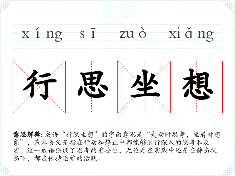 成语“行思坐想”的字面意思是“走动时思考,坐着时想象”,基本含义是指在行动和静止中都能够进行深入的思考和反省。这一成语强调了思考的重要性,无论是在实践中还是在静态状态下,都应保持思维的活跃。