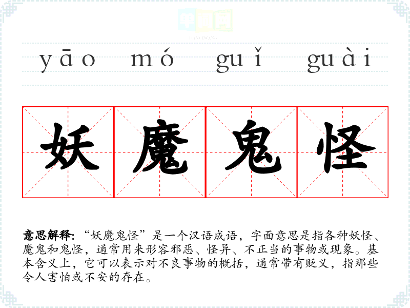 “妖魔鬼怪”是一个汉语成语,字面意思是指各种妖怪、魔鬼和鬼怪,通常用来形容邪恶、怪异、不正当的事物或现象。基本含义上,它可以表示对不良事物的概括,通常带有贬义,指那些令人害怕或不安的存在。