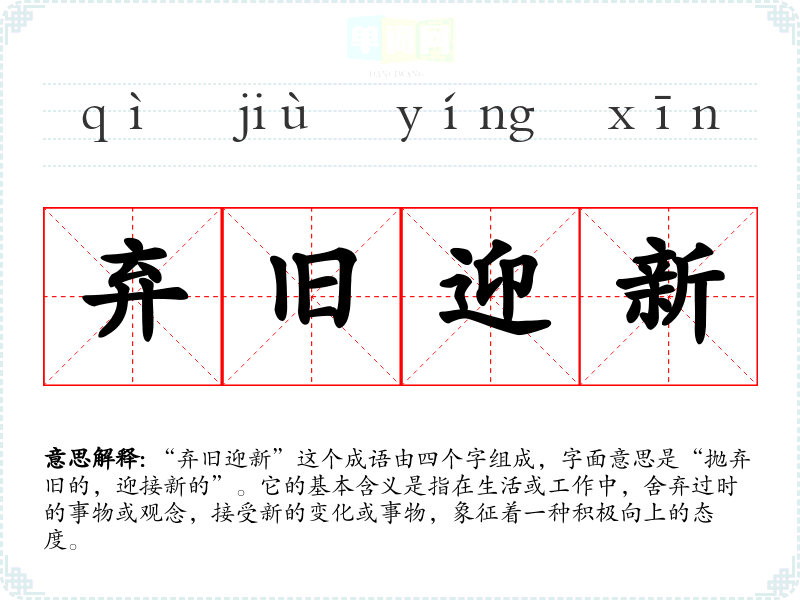 “弃旧迎新”这个成语由四个字组成,字面意思是“抛弃旧的,迎接新的”。它的基本含义是指在生活或工作中,舍弃过时的事物或观念,接受新的变化或事物,象征着一种积极向上的态度。