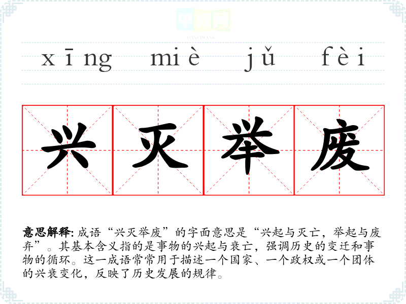 成语“兴灭举废”的字面意思是“兴起与灭亡,举起与废弃”。其基本含义指的是事物的兴起与衰亡,强调历史的变迁和事物的循环。这一成语常常用于描述一个国家、一个政权或一个团体的兴衰变化,反映了历史发展的规律。