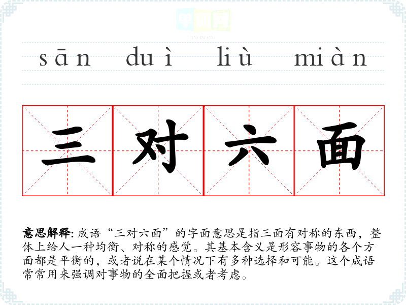 成语“三对六面”的字面意思是指三面有对称的东西,整体上给人一种均衡、对称的感觉。其基本含义是形容事物的各个方面都是平衡的,或者说在某个情况下有多种选择和可能。这个成语常常用来强调对事物的全面把握或者考虑。