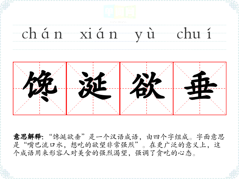“馋涎欲垂”是一个汉语成语,由四个字组成。字面意思是“嘴巴流口水,想吃的欲望非常强烈”。在更广泛的意义上,这个成语用来形容人对美食的强烈渴望,强调了贪吃的心态。