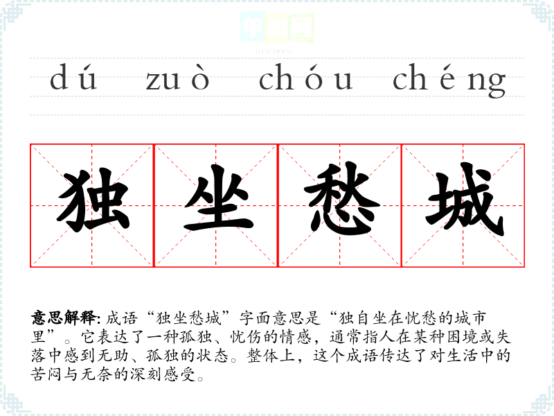 - 孤独寂寞:强调孤独的状态,和“独坐愁城”同样传达孤独感。