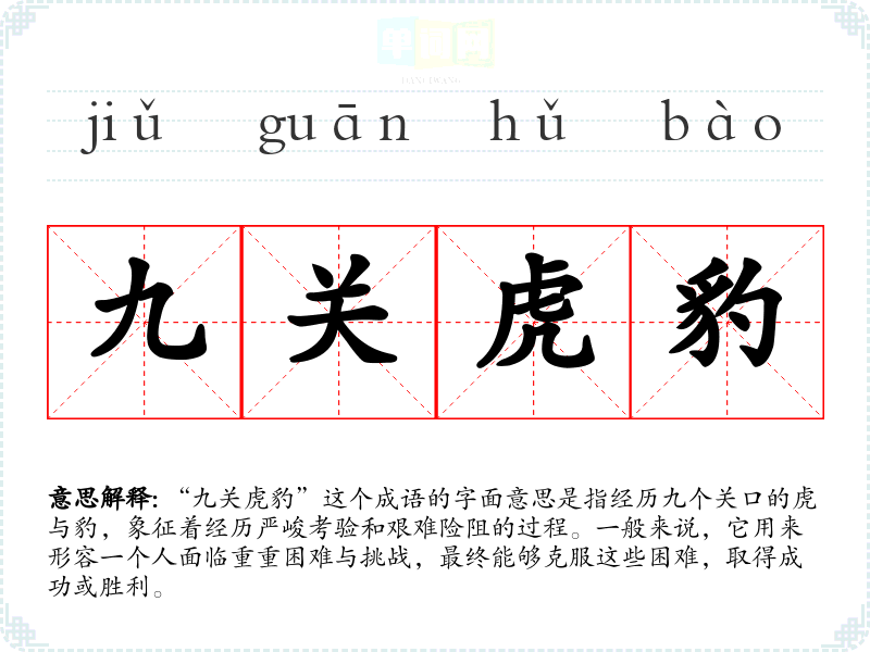 “九关虎豹”这个成语的字面意思是指经历九个关口的虎与豹,象征着经历严峻考验和艰难险阻的过程。一般来说,它用来形容一个人面临重重困难与挑战,最终能够克服这些困难,取得成功或胜利。