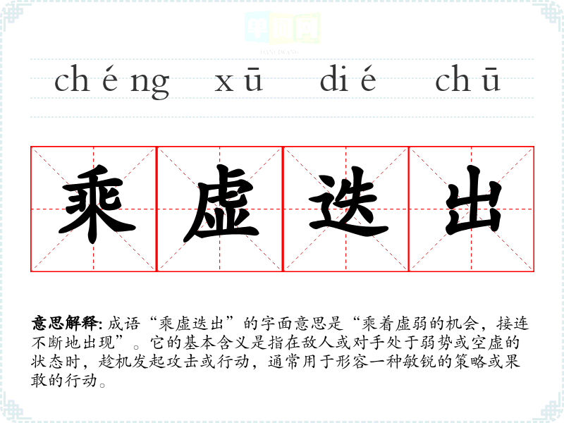 成语“乘虚迭出”的字面意思是“乘着虚弱的机会,接连不断地出现”。它的基本含义是指在敌人或对手处于弱势或空虚的状态时,趁机发起攻击或行动,通常用于形容一种敏锐的策略或果敢的行动。