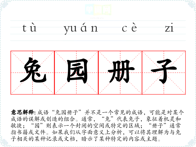 成语“兔园册子”并不是一个常见的成语,可能是对某个成语的误解或创造的组合。通常,“兔”代表兔子,象征着机灵和敏捷;“园”则表示一个封闭的空间或特定的区域;“册子”通常指书籍或文件。如果我们从字面意义上分析,可以将其理解为与兔子相关的某种记录或文档,暗示了某种特定的内容或主题。