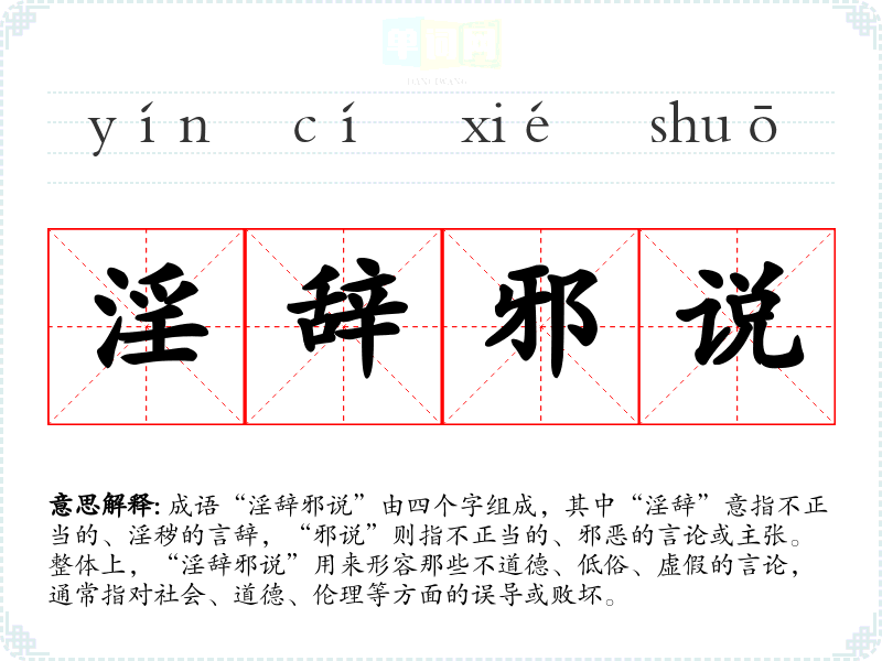 成语“淫辞邪说”由四个字组成,其中“淫辞”意指不正当的、淫秽的言辞,“邪说”则指不正当的、邪恶的言论或主张。整体上,“淫辞邪说”用来形容那些不道德、低俗、虚假的言论,通常指对社会、道德、伦理等方面的误导或败坏。