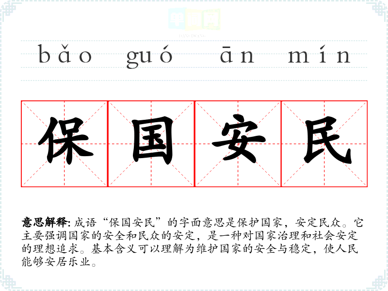 | 保国安民 | 保卫国家,使人民安居乐业。 |