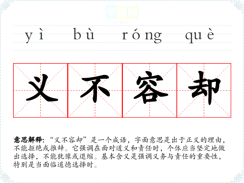 “义不容却”是一个成语,字面意思是出于正义的理由,不能拒绝或推辞。它强调在面对道义和责任时,个体应当坚定地做出选择,不能犹豫或退缩。基本含义是强调义务与责任的重要性,特别是当面临道德选择时。