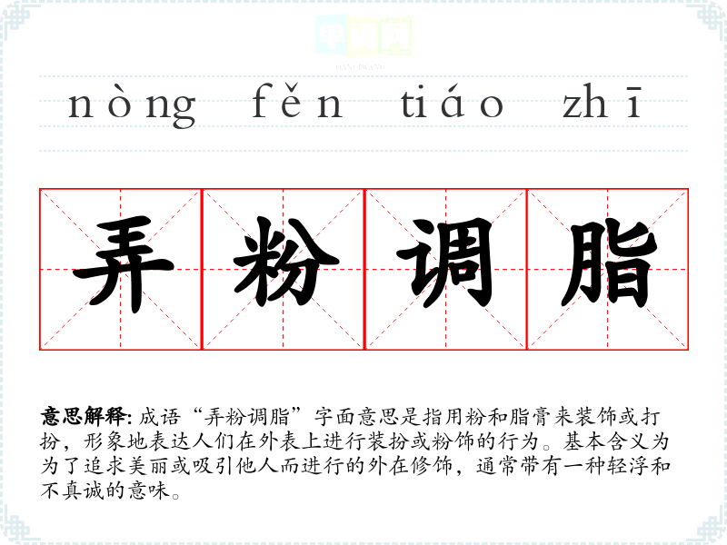 成语“弄粉调脂”字面意思是指用粉和脂膏来装饰或打扮,形象地表达人们在外表上进行装扮或粉饰的行为。基本含义为为了追求美丽或吸引他人而进行的外在修饰,通常带有一种轻浮和不真诚的意味。