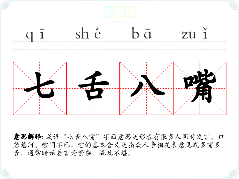 成语“七舌八嘴”字面意思是形容有很多人同时发言,口若悬河,喧闹不已。它的基本含义是指众人争相发表意见或多嘴多舌,通常暗示着言论繁杂、混乱不堪。