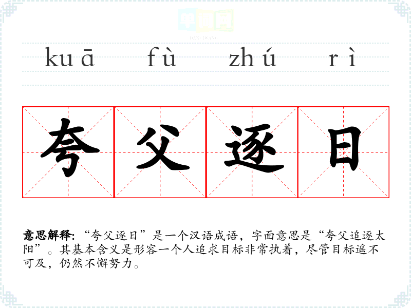 “夸父逐日”是一个汉语成语,字面意思是“夸父追逐太阳”。其基本含义是形容一个人追求目标非常执着,尽管目标遥不可及,仍然不懈努力。