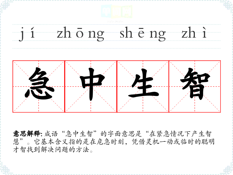 成语“急中生智”的字面意思是“在紧急情况下产生智慧”。它基本含义指的是在危急时刻,凭借灵机一动或临时的聪明才智找到解决问题的方法。