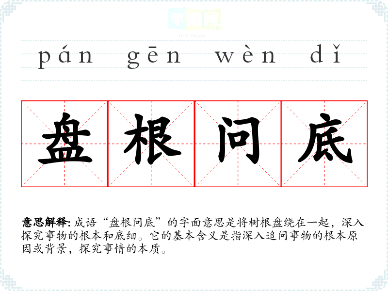 成语“盘根问底”的字面意思是将树根盘绕在一起,深入探究事物的根本和底细。它的基本含义是指深入追问事物的根本原因或背景,探究事情的本质。