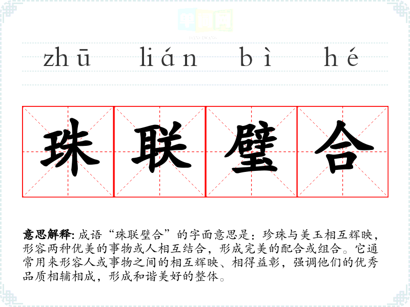 成语“珠联璧合”的字面意思是:珍珠与美玉相互辉映,形容两种优美的事物或人相互结合,形成完美的配合或组合。它通常用来形容人或事物之间的相互辉映、相得益彰,强调他们的优秀品质相辅相成,形成和谐美好的整体。