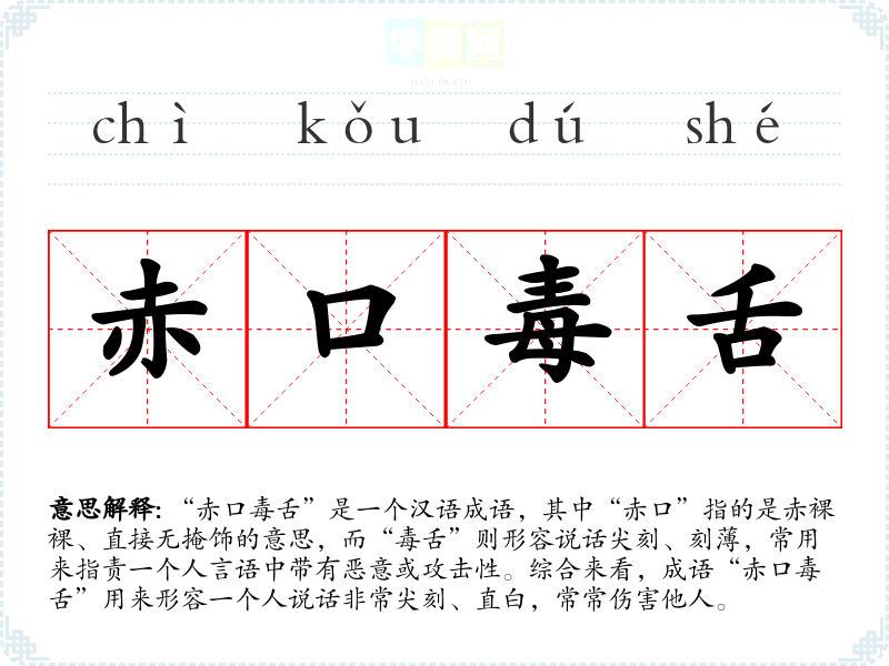 | 赤口毒舌 | 赤:火红色。形容言语恶毒,出口伤人。 |