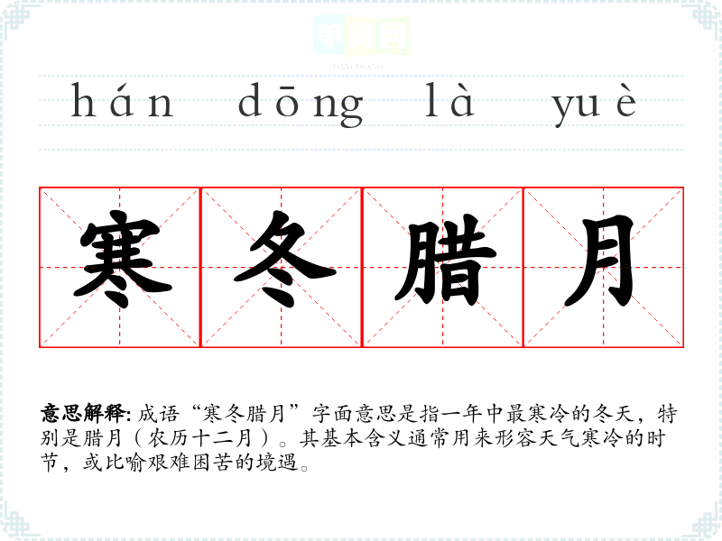 成语“寒冬腊月”字面意思是指一年中最寒冷的冬天,特别是腊月(农历十二月)。其基本含义通常用来形容天气寒冷的时节,或比喻艰难困苦的境遇。