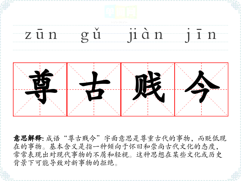 - 同义成语:尊古、崇古、贬今。这些成语都传达了对古代文化的崇尚和对现代事物的贬低。