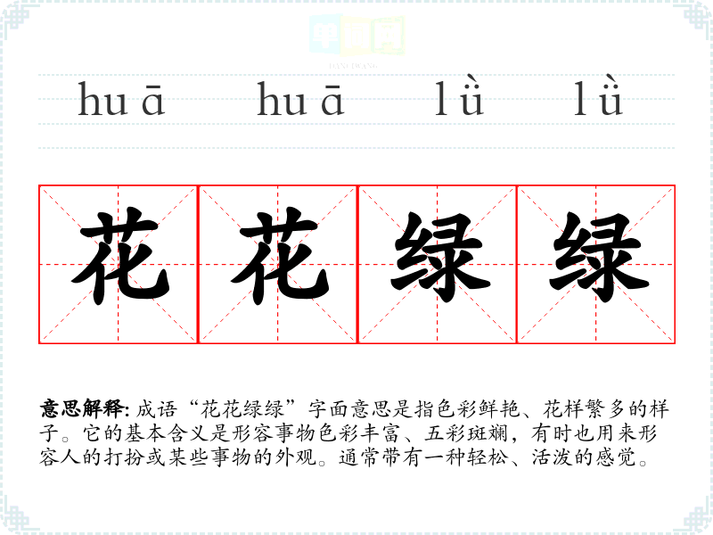 成语“花花绿绿”字面意思是指色彩鲜艳、花样繁多的样子。它的基本含义是形容事物色彩丰富、五彩斑斓,有时也用来形容人的打扮或某些事物的外观。通常带有一种轻松、活泼的感觉。