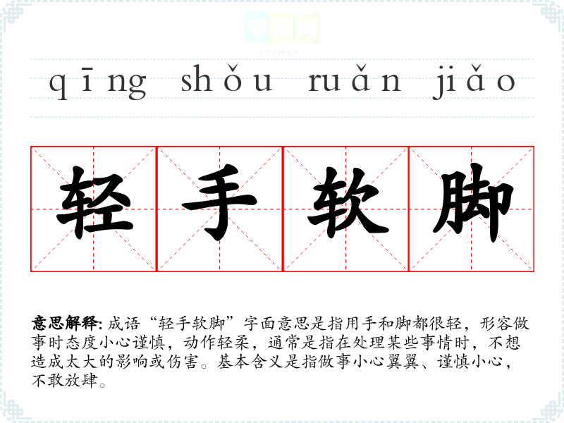 成语“轻手软脚”字面意思是指用手和脚都很轻,形容做事时态度小心谨慎,动作轻柔,通常是指在处理某些事情时,不想造成太大的影响或伤害。基本含义是指做事小心翼翼、谨慎小心,不敢放肆。