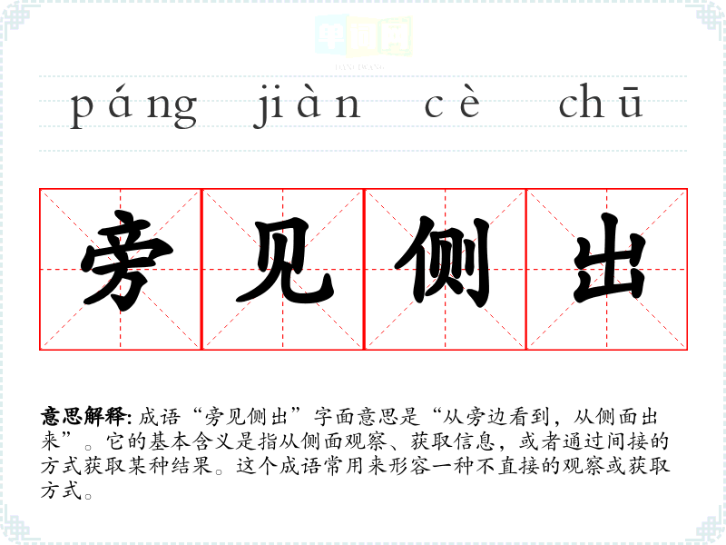 成语“旁见侧出”字面意思是“从旁边看到,从侧面出来”。它的基本含义是指从侧面观察、获取信息,或者通过间接的方式获取某种结果。这个成语常用来形容一种不直接的观察或获取方式。